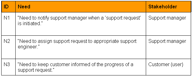 to fulfill one or more stakeholder needs. Let's return to our example of a help desk support application. Table 2 shows three stakeholder requests expressed as needs. Table 2: Stakeholder needs