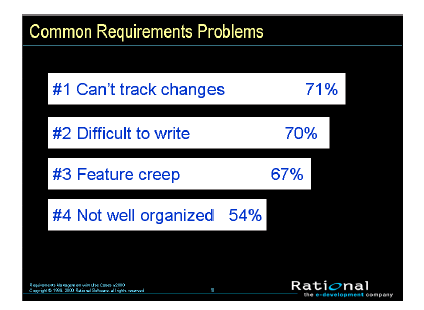 当这些问题与需求管理和处理技能不足以及缺乏易用工具等情况一同出现时,许多团队都对管理好需求不抱希望了。Rational Software