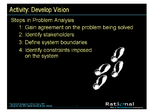 在问题分析中,主要的活动是制定项目前景。此活动的结果是产生了一个前景文档,它确定了待建系统的高级用户或客户视图。前景文档将初始需求作为关键特性表述,这些特性是系统为了解决重大问题并满足关键涉众需要而必须具备的。系统分析员在此工作流程中扮演主要角色。系统分析员应该具有问题分析领域的专业知识,对问题有一定的理解,还应该能描述其认为可以解决问题的流程。此阶段要求各个项目涉众积极参与,还应该考虑所有相关的涉众请求。