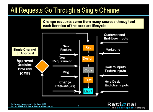 需求变更表明多少需要耗费一些时间来实施某个特定的功能,而且对一个需求的变更对其他需求可能有影响。管理需求变更包括这样一些活动:设立基线、追踪每个需求的历史、确定哪些依赖关系值得追踪、在相关项之间建立可追踪关系以及维护版本控制等。如图 3 所示,建立变更控制或批准流程也很重要,它要求由指定的团队成员来复审所有提议的变更。有时候这一单一的变更控制渠道称为变更控制委员会 (CCB)。