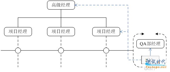 在职能结构中,各个职能部门设立自己的 QA 岗位,位于高级经理之下,独立于项目组。 QA 直接对高级经理负责,但业务上需要向项目经理汇报,属于项目成员。如图 1 所示。这种组织结构的优点是 QA 容易融入项目组,易于发现实质性的问题,解决问题也很快捷。缺点是各职能部门相对独立,部门之间的经验缺乏交流和共享,还可能出现对过程、方法和工具研究的重复性投资。在这种组织结构下,由于高级经理专注于业务的发展, QA 的职业发展容易受到忽视,难于接受到应有的培训和提升。