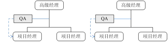 在矩阵结构中,设立了专门的 QA 部门,与各业务职能部门平级。 QA 隶属于 QA 部,行政上向 QA 经理负责,业务上向业务部门的高级经理和项目经理汇报。如图 2 所示。在这种组织结构中,由 QA 部经理对 QA 考评和授权,有利于保证 QA 的独立性和评价的客观性,也有利于确保组织的长期利益与项目(或个人)的短期利益之间的平衡。 QA 资源为所有项目所共享,可按照项目优先级动态调配,资源利用更充分,但也可能出现资源竞争冲突。此外, QA 部门对 QA 流程的改进、 QA 知识的管理、 QA 人员的发展负责,并可集中资源进行 QA 平台的建设,以防止重复性的投资。但另一方面,在矩阵结构中, QA 难于融入项目组,发现的问题也很少能得到及时有效的解决。