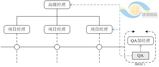 在职能结构中,各个职能部门设立自己的 QA 岗位,位于高级经理之下,独立于项目组。 QA 直接对高级经理负责,但业务上需要向项目经理汇报,属于项目成员。如图 1 所示。这种组织结构的优点是 QA 容易融入项目组,易于发现实质性的问题,解决问题也很快捷。缺点是各职能部门相对独立,部门之间的经验缺乏交流和共享,还可能出现对过程、方法和工具研究的重复性投资。在这种组织结构下,由于高级经理专注于业务的发展, QA 的职业发展容易受到忽视,难于接受到应有的培训和提升。