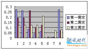 1需求管理 2项目计划 3项目跟踪和监控 4配置管理 5软件质量保证 6同行评审 7培训 8软件产品工程 9 其它 如图可见,需求管理、计划管理和产品工程被列入第一需求的比例最高,但是三者之的统计差距不明显,表明不同企业之间的差异较大,统计后趋向平均。列入第二需求比例最高的是计划跟踪和监控。列入第三需求比例最高的是质量保证。总体次序是:需求管理、项目计划、产品工程、项目跟踪和监控、质量保证、配置管理、培训、同行评审