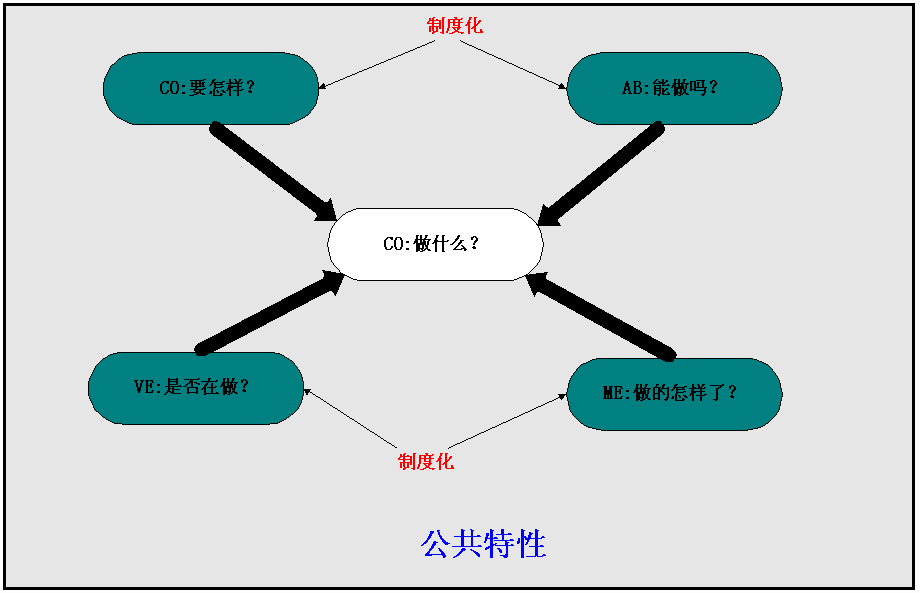 这是企业管理的五个主要环节;一个好的管理要建立大政“方针”的明确承诺和要求、要提供必要的资源和“能力”,这样才能进行必要的“活动”,要“验证”活动被执行(类似于QA),要对活动进行“测量”保证了解活动的情况和质量(类似于