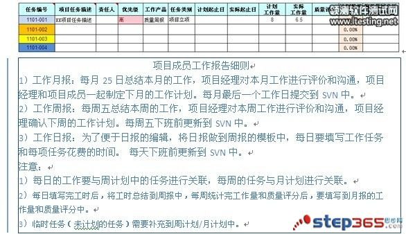 项目成员需要填写《项目成员工作报告》,分为每天的日报,每周末的周报,每月末的月报,项目经理在其中填写“质量评分”一栏,质量评分的取得是项目经理在QA的配合下取得的,由QA提供考核技术的支持。