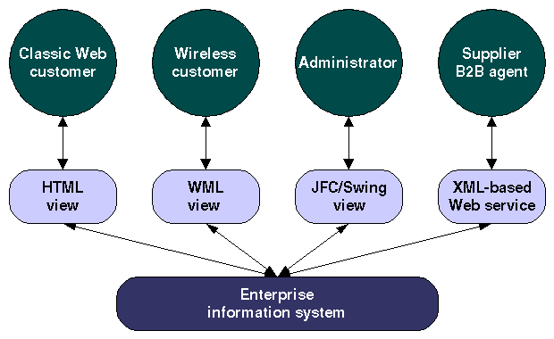 在sun网站上提供的宠物商店的范例中,就把MVC模式的思想扩展成为架构的思想,用于提供不同的界面视图: