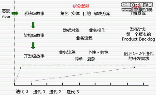 下图说明了一般情况下各种武器在不同阶段的使用场景,迭代0是非常关键的一个阶段,它会就需求、设计、团队等多方面为以后的迭代做准备。就需求这个范畴,这个阶段会根据这些武器逐步拆分和理解需求,并保证需求不过度分析,不产生额外的浪费,以最小的成本适应变化的需求。