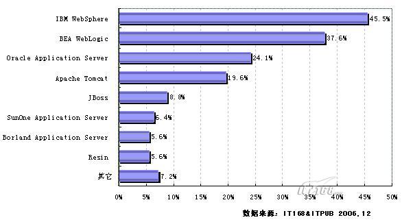 调查显示,目前应用服务器的占有量已经超过消息服务中间件。而在应用服务器的市场占有量来看,IBM,BEA,Oracle以45.5%,37.6%,24.1%处于前3位。但在开源的应用服务器JBoss的使用量却只占到了8.8%,看来在一些关键领域的应用上面,人们对开源产品的使用还是比较慎重。