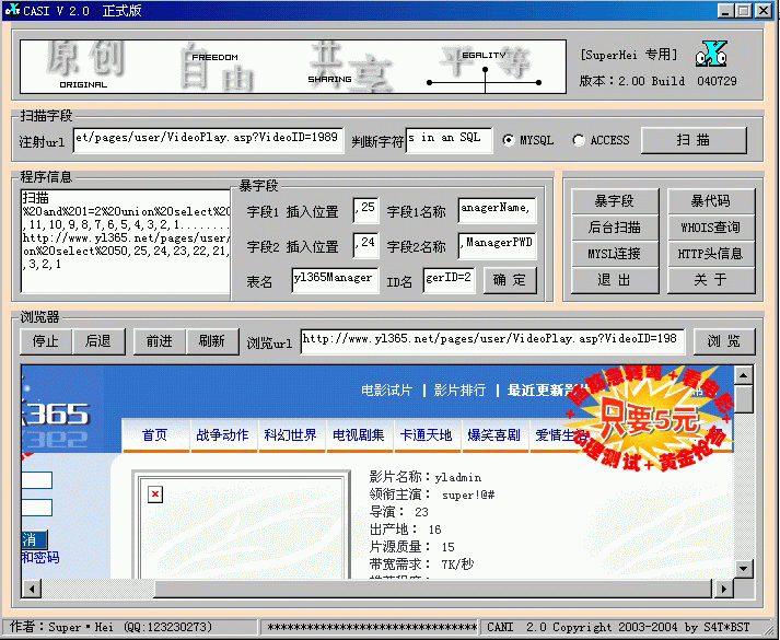 http://www.xxx.netVideoPlay.asp?VideoID=1995 and 1=2 union select 1,1,1,1.........这样的形式,这个和mysql和acc的使用union语句是一样的,这样如果我们精心构造我们的语句就可以使注射通用于acc,mysql>4.0,mssql或所有支持union的数据类型。