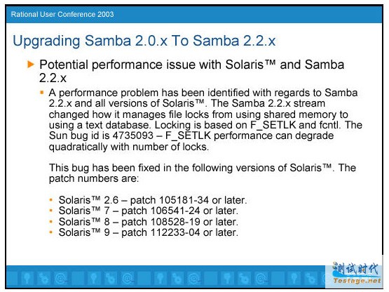 Samba 2.0.7是上一个稳定版本,现在2.2 stream已经发布。2.2 stream有几个性能的问题,直到2.2.7。一个问题是Solaris平台的,即使当前的发布版本仍有问题,你需要一些补丁来避免CPU高利用率的问题。这个问题的原因是他们修改了他们管理锁的方法。从使用共享内存改为了使用他们自己的文本数据库。这个文本数据库使用fcntl系统调用和F_SETLK 来管理锁。在锁的数量增加时性能呈指数降低。我没有实际碰到这个问题,因为我从来没有使用过Samba 2.2.2,但是我曾经在mailing list中看到过有人碰到过CPU利用率非常高的问题。一旦你的CPU利用率超过75%,一定是一个问题。所有的Solaris版本都有解决这个问题的补丁,因此我建议你使用这些补丁。
