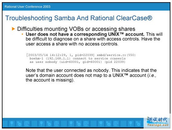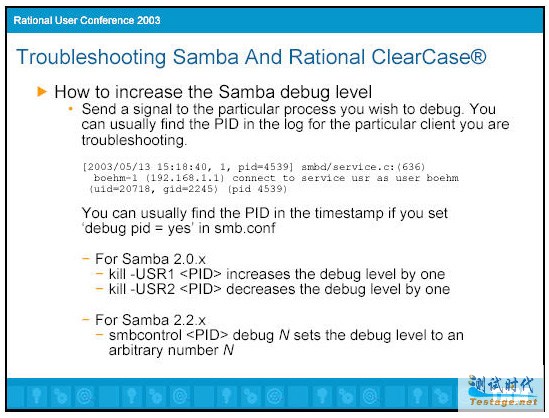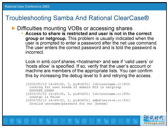即使上面的都可以通过,你仍然会遇到不能访问VOB数据的问题。有很多其它的因素会导致错误。典型地,你下一步需要做的是,增加调试级别,以便得到更多的相关信息。我通常做的第一步是不通过ClearCase,试着访问共享目录,以保证网络部分工作正常。我使用net use命令试着访问共享。在这里你肯定希望看到错误。如果用户指定了错误的密码,你可以在Samba日志中清楚地看到。它说:"NT_STATUS_WRONG_PASSWORD"。这经常发生在用户刚刚修改了密码但是没有重新登陆时。解决方法很简单,退出并重新登陆。