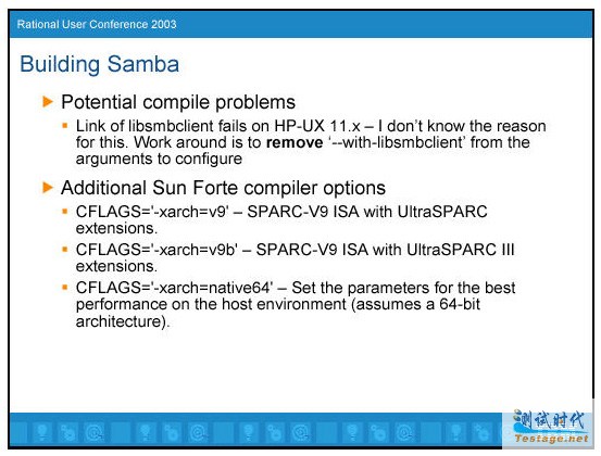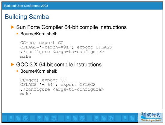 得到源代码是很容易的。当前的版本是2.2.8a,它已经被证实可以用在ClearCase上。你可以从Samba website得到源代码。注意它有一个优势是源代码可以编译为64位的应用程序。我在2001年遇到的问题是我不能够Build。即使我限制了mnode设置,它仍然不能工作。我给出了一个补丁可以让我打开更多的文件,并把它提交给了Samba开发组。64-Bit 编译可以让你打开更多的文件而不用限制 mnodes的个数(稍后讨论)。一些操作系统可能不需要编译成64-bit。图1描述了在Solaris环境中构建Samba。