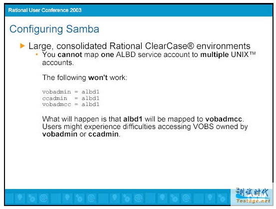 要记住的一点是,这种映射仅仅用于访问cleartext 和source containers,这就是ALBD 服务为你做的事情。它并不处理正常的 ClearCase访问控制。如果有人以vobadm01登陆并试图check out文件,它并不映射为vobadm帐号,仍然是vobadm01帐号。