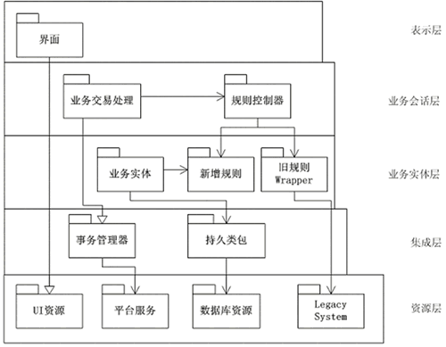业务层的设计比较简单,暂时只是把它实现为一组的业务类。类似的,表示层的设计也没有做更多的处理。表示层的类是继承自资源层的。这是一种处理的方法,当然,也可以是使用关系,这和具体的实现环境和设计人员的偏好都有关系,并不是唯一的做法。在对软件的大致架构有了一个初步了解之后,我们需要进一步挖掘需求,来细化我们的设计。在前面的设计中,我们对业务层的设计过于粗糙了。在我们的应用中,还存在一个旧系统,这个系统中实现了应用规则,从应用的角度来看,这些规则目前仍然在使用,但新的系统中会加入新的规则。在新系统启用后,旧的系统中的规则处理仍然需要发挥它的作用,因此不能够简单的把所有的规则转移到新系统中。(有时候我们是为了节省成本而不在新系统中实现旧系统的逻辑)。我们第二步的架构设计的细化过程中将会加入对新的要求的支持。