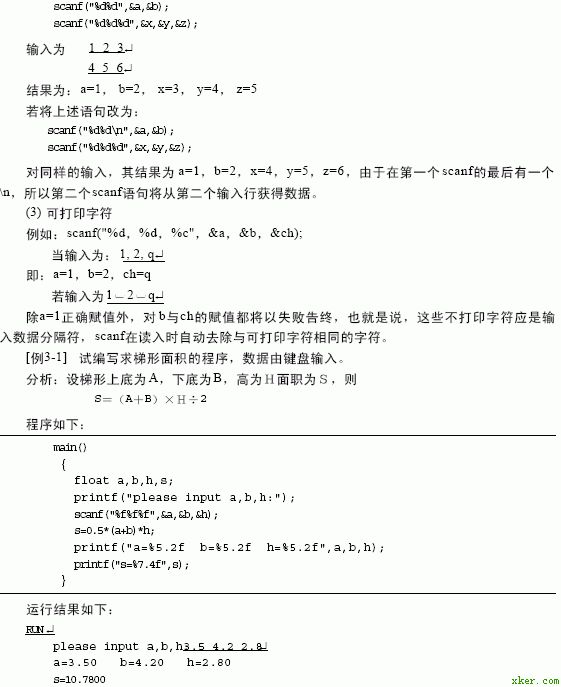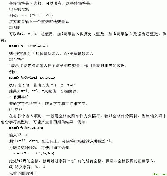 其中控制字符串规定数据的输入格式,必须用双引号括起,其内容是由格式说明和普通字符两部分组成。输入项列表则由一个或多个变量地址组成,当变量地址有多个时,各变量地址之间用逗号“,”分隔。