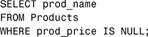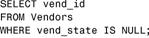 这条语句返回没有价格(空prod_price字段,不是价格为0)的所有产品,由于表中没有这样的行,所以没有返回数据。但是,Vendors表确实包含有具有空值的列,如果没有州数据,则vend_state列将包含NULL值(在没有U.S.地址时类似):
