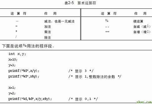 表2-5列出了C语言中允许的算术运算符。在C语言中,运算符“+”、“-”、“*”和“/”的用法与大多数计算机语言的相同,几乎可用于所有C语言内定义的数据类型。当“/”被用于整数或字符时,结果取整。例如,在整数除法中,10/3=3。