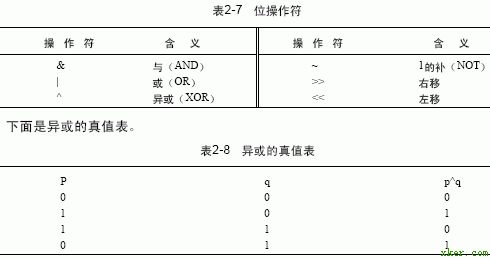 与其它语言不同,C语言支持全部的位操作符(BitwiseOperators)。因为C语言的设计目的是取代汇编语言,所以它必须支持汇编语言所具有的运算能力。位操作是对字节或字中的位(bit)进行测试、置位或移位处理,这里字节或字是针对C标准中的char和int数据类型而言的。位操作不能用于float、double、longdouble、void或其它复杂类型。表2-7给出了位操作的操作符。位操作中的AND、OR和NOT(1的补码)的真值表与逻辑运算等价,唯一不同的是位操作是逐位进行运算的。