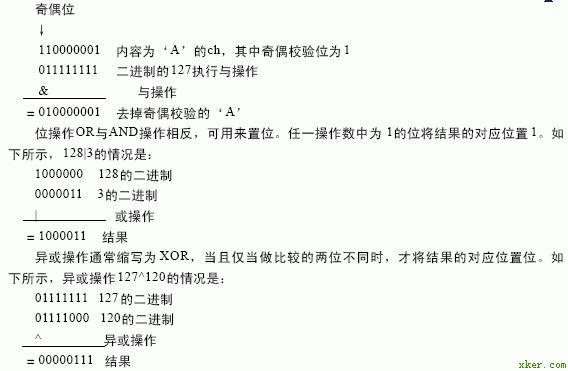 字节的位8是奇偶位,将该字节与一个位1到位7为1、位8为0的字节进行与操作,可将该字节的奇偶校验位置成0。表达式ch&127正是将ch中每一位同127数字的对应位进行与操作,结果ch的位8被置成了0。在下面的例子中,假定ch接收到字符"A"并且奇偶位已经被置位。