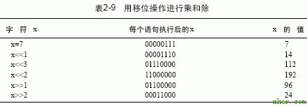 移位操作可对外部设备(如D/A转换器)的输入和状态信息进行译码,移位操作还可用于整数的快速乘除运算。如表2-9所示(假定移位时补0),左移一位等效于乘2,而右移一位等效于除以2。