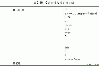 表2-10列出了C语言所有操作符的优先级,其中包括将在本书后面讨论的某些操作符。注意,所有操作符(除一元操作符和?之外)都是左结合的。一元操作符(*,&和-)及操作符“?”则为右结合。