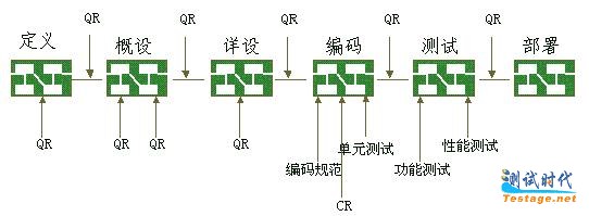 根据上面这条思路,我们采取下面具体措施来把握软件的质量: Quality review,编码规范, Code review,单元测试,功能测试,性能测试,UAT测试。将他们具体到软件开发周期的各个阶段,如下图所示: