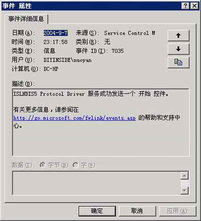 选中事件查看器左边的树形结构图中的日志类型(应用程序、安全性或系统),在右侧的详细资料窗格中将会显示出系统中该类的全部日志,双击其中一个日志,便可查看其详细信息,如图2。在日志属性窗口中我们可以看到事件发生的日期、事件的发生源、种类和ID,以及事件的详细描述。这对我们寻找解决错误是最重要的。