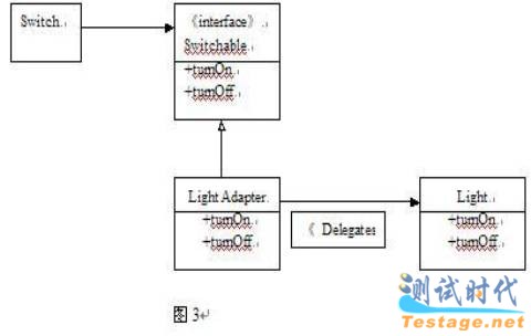 上面图2所示解决方案,违返了单一职责原则(SRP),它把Switch和Light绑定在一起,而它们可能会因为不同的原因而改变。这种问题可以采用ADAPTER模式来解决,适配器从Switchable 派生并委托给Light,问题就被优美的解决了,现在,Switch就可以控制任何能够被打开或者关闭的对象。但是这也需要会出时间和空间上的代价来换取。如下面图3所示:
