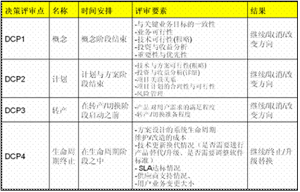 规划的执行。在许多企业,项目的发起往往不仅仅是自上而下的过程,还存在着大量的自下而上的项目。因此,要想使企业级的项目规划得以贯彻,需要在项目管理环节增加这样的环节:判断项目是否需要继续投入?具体说来,就是在项目过程中,在一些关键阶段设置决策点,在决策点上,企业的高层需要介入项目。以研发项目举例,参见表1。