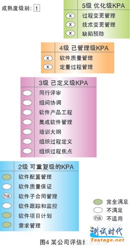 在所有的评估活动中,大家最关心的恐怕就是评估的结果是如何确定的了。其实有了评估时前面数天的成果,最终的结论是很容易做出的。评估小组根据作出的一条条观察项,逐条检查用词是否合理恰当,是否得到了多个数据来源的反复确证,是否有不同观察项之间存在矛盾的情况。如果这些观察项都得到了检查并被确认无误,评估小组会对找到的不足之处(发现的弱点)进行分析,看是否对KPA下面的目标实现有显著的影响。评级的思路可以参见图3: 在CMM中,每个KPA下面都有若干个目标,并有数条关键实践与目标对应。如果一个目标对应的关键实践没有明显的弱点阻碍该目标的实现,则认为该目标得到了满足。如果一个关键过程区域下面的所有目标都满足了,则该KPA也就是满足的。当某个成熟度级别之下所有的KPA都是满足的,则被评估的公司成熟度级别就是此级别。这句话必须要正确的理解:一方面,如果一家公司希望成为CMM 3级的组织,则必须在评估中把2级和3级包含的所有关键过程区域都做到满足才能实现这一目标。另外,即便某家公司已经在正式评估中达到了2级的要求,一段时间后该公司希望进行3级的评估,2级的内容同样要在评估中检查。另一方面,举个极端的例子来说,如果一家公司做3级的评估,评估结果是3级的所有KPA均得到了满足,但2级中如果有不满足的KPA,则该公司的成熟度级别为1级。虽然这情况几乎不可能出现,因为如果该公司2级有做得不好的KPA,3级的KPA几乎不可能全都做得很好。图4是比较常见的一种情况,因为2级中有没有做好的KPA,虽然是做3级的评估,但结果是1级: