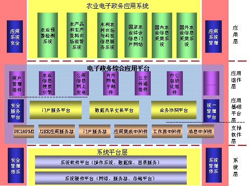 农业电子政务系统还需要建立起完备的安全体系,从各种不同的方面入手保证系统的安全性,其中一个重要的环节就是要建立起安全平台,为各种应用提供安全基础服务。