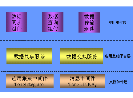• 支撑软件层,这一部分主要包括两类中间件产品,包括消息中间件 TongLINK/Q,应用集成中间件TongIntegrator,中间件产品提供基本的数据交换功能。