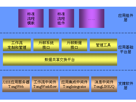 • 支撑软件层,这一部分主要包括工作流中间件 TongWorkflow和J2EE应用服务器TongWeb,提供工作流程的基本服务和管理功能。