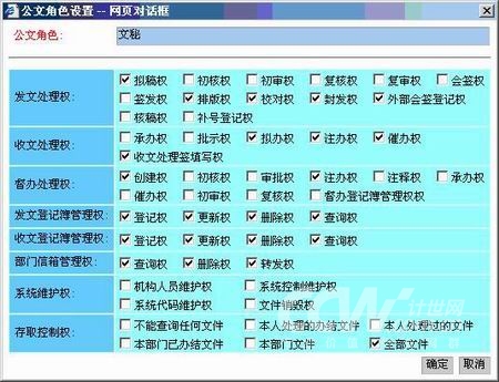 在公文处理中,根据系统业务功能并结合用户实际应用,提取出公文使用权限,包括发文处理权、收文处理权、督办处理权、发文登记簿管理权、收文登记簿管理权、部门信箱管理权、系统维护权和存取控制权。通过建立角色,可以把权限赋予某类用户,同时,也可以为用户单独设置权限。