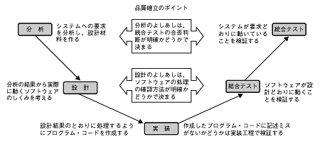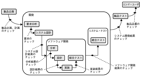从系统分析到实装是开发工程,每个开发工程都对应测试工程.从而保证质量.