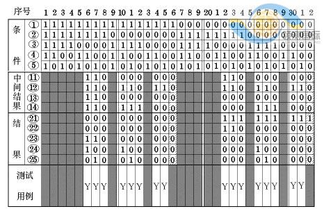 4) 在判定表中,阴影部分表示因违反约束条件的不可能出现的情况,删去。第16列与第32列因什么动作也没做,也删去。最后可根据剩下的16列作为确定测试用例的依据。