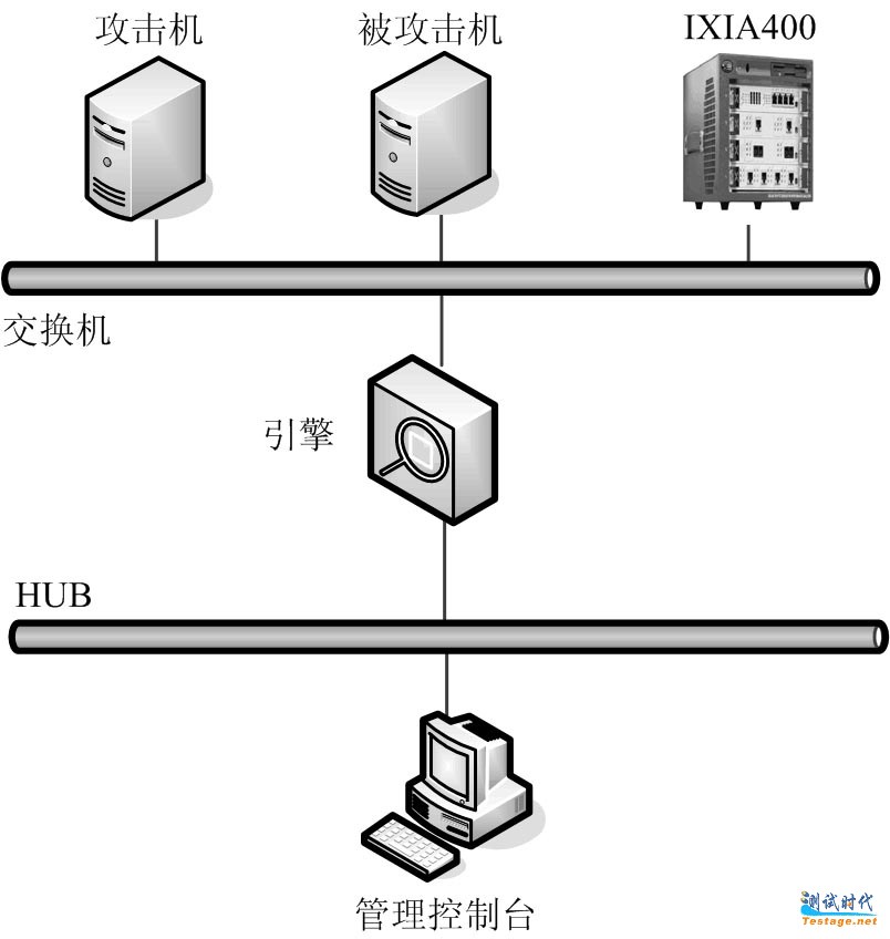 测试环境的搭建是测试部署中较为重要的部分,它直接影响测试结果的准确性。为了使测试处于可控状态,避免更多的外部因素干扰测试结果的分析,在进行IDS性能测试时需要搭建一个封闭的网络环境。图2是我们进行鹰眼网络入侵检测系统产品面向用户的漏报率性能指标测试的环境图。需要注意的是,该拓扑图只是较通用的一个,在实际使用中,根据测试指标的不同,可能会有不同的测试环境部署。