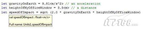 F#中一项突破性的开创就是度量单位的定制,我们可以对浮点编码进行单位注释,比如米或秒。这很容易做到,他的好处就是当浮点编码与注释不符合的时候会报错。这样在不牺牲性能的前提下,就可以对浮点编码进行检测了。