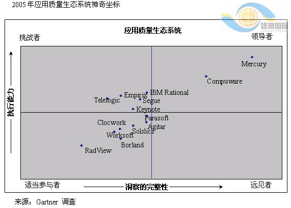 上图是美国gartner公司的2005年的调查结果,位于坐标第一象限最右上角的就是mercury,图中还有其他我们熟知的几个公司,如IBM rational、compuware等,但是mercury长久以来,一直独占着软件测试工具提供商的领先地位。