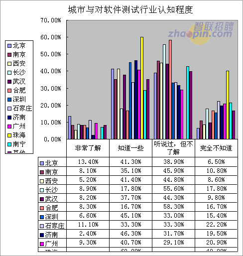 从城市分布来看,大城市和东部沿海城市对于软件测试行业认知程度较高。对于软件测试行业认知程度较高的城市除北京以外,主要集中在东部沿海地区,如南京、深圳、珠海、广州等,而在中部只有武汉比较突出,西部则西安对于此行业的认知程度较高。