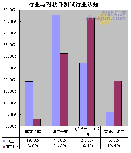 关于行业,从事IT行业的职场人对于软件测试行业的了解程度远远高于非IT行业的职场人。但是值得注意的是,有近半数的非IT行业从业者对于软件测试行业听说过但不了解。可见这一行业目前越来越深入人心,只是更多的人还不了解该行业的具体内涵,也充分证明伴随软件测试行业的认知程度不断提高,会有越来越多的非IT行业从业者了解该行业。