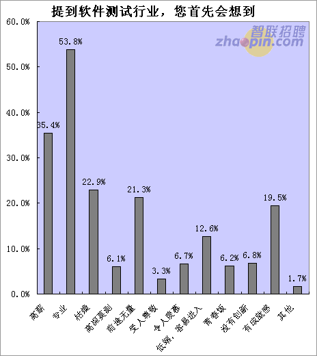 对于听说过软件测试和了解软件测试的职场人来说,提到软件测试首先想到的就是“专业”,选择这一选项的职场人超过了半数,可见软件测试行业的专业性最被职场人认可。其次,被提及最多的特征是“高薪”,在一部分职场人心目中,软件测试行业拥有令人羡慕的薪酬水平。当然,也不乏会有人认为软件测试工作是一项枯燥的工作,尽管对于软件测试行业的态度褒贬不一,但是正面的评价明显多于负面,总体来说,职场人认为软件测试行业是一个专业具有较高薪酬水平、较好发展空间的行业。