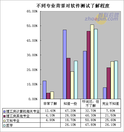 在对于软件测试行业的认知程度上,理工类背景的职场人比文科和医学背景的职场人要高的多,而理工类计算机专业相关背景的职场人对于软件测试行业的认知程度又明显高于理工类非计算机专业背景的职场人。可见,目前对于软件测试行业的了解还是主要集中于IT相关背景的职场人,而其他专业的人对于此行业了解程度还远远不够。