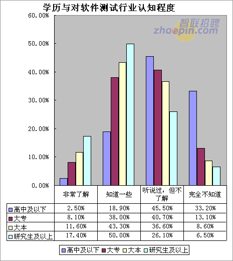 调查显示,伴随学历的提高,对于软件测试行业的认知程度也明显提高,二者呈正相关关系。高中及以下学历者对于该行业非常了解和了解一些的只有两成,大专学历则超过了四成,大本学历的职场人这两部分相加则超过了半数,而研究生及以上这两部分人相加超过六成,将近70%。可见,高学历背景职场人对于软件测试行业认知程度高。