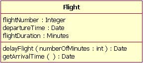 类的 UML 表示是一个长方形,垂直地分为三个区,如图 1 所示。顶部区域显示类的名字。中间的区域列出类的属性。底部的区域列出类的操作。当在一个类图上画一个类元素时,你必须要有顶端的区域,下面的二个区域是可选择的(当图描述仅仅用于显示分类器间关系的高层细节时,下面的两个区域是不必要的)。图 1 显示一个航线班机如何作为 UML 类建模。正如我们所能见到的,名字是 Flight,我们可以在中间区域看到Flight类的3个属性:flightNumber,departureTime 和 flightDuration。在底部区域中我们可以看到Flight类有两个操作:delayFlight 和 getArrivalTime。