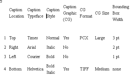 Now imagine working from a test matrix. A test case is specified by a combination of the values of the many parameters. In the matrix, each row specifies a test case and each column is a parameter setting. For example, Column 1 might specify the Caption Location, Column 2 the Caption Typeface, and Column 3 the Caption Style. There are a few dozen columns.