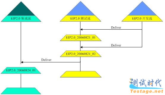3.3 设置合适的并行开发模式考虑到EIP项目的实际情况,我们采用IBM的UCM(统一变更管理)解决方案作为它的配置管理和变更管理解决方案。对EIP项目发布版本错误问题产生原因进行分析后,我们采用如下流策略作为该项目的并行开发模式。
