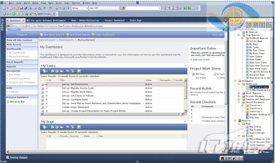 在VSTS2010中,Share Point的Web Access也非常强大,Web 端各种工具功能项与软件生命周期过程紧密集成。VSTS2010提供了强大的Web过程管理模板,包括BUG过程控制与跟踪。VSTS2010与Share Point管理模板,如图12所示。