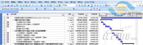 VSTS 2010在协作功能上则通过TFS增强包括提供流程模板,除了允许团队可以配置及采用任何喜欢的敏捷式(Agile)软件开发模式外,团队也可根据丰富的工作项目连结进行追踪,并建立有层次的工作项目关联。在应用程序生命周期管理中,我们最关心的是项目的管理人员如何参与到整个生命周期中来。通过TFS与Peoject和Excel之间的紧密协作,项目的管理人员可以使用自己熟悉的项目管理工具,直接从TFS获取项目的相关信息, 通过丰富的项目报表,了解项目的运行情况,准确地对项目中的各项任务进行计划和管理。Project与VSTS的协作,产生项目计划,如图13所示。